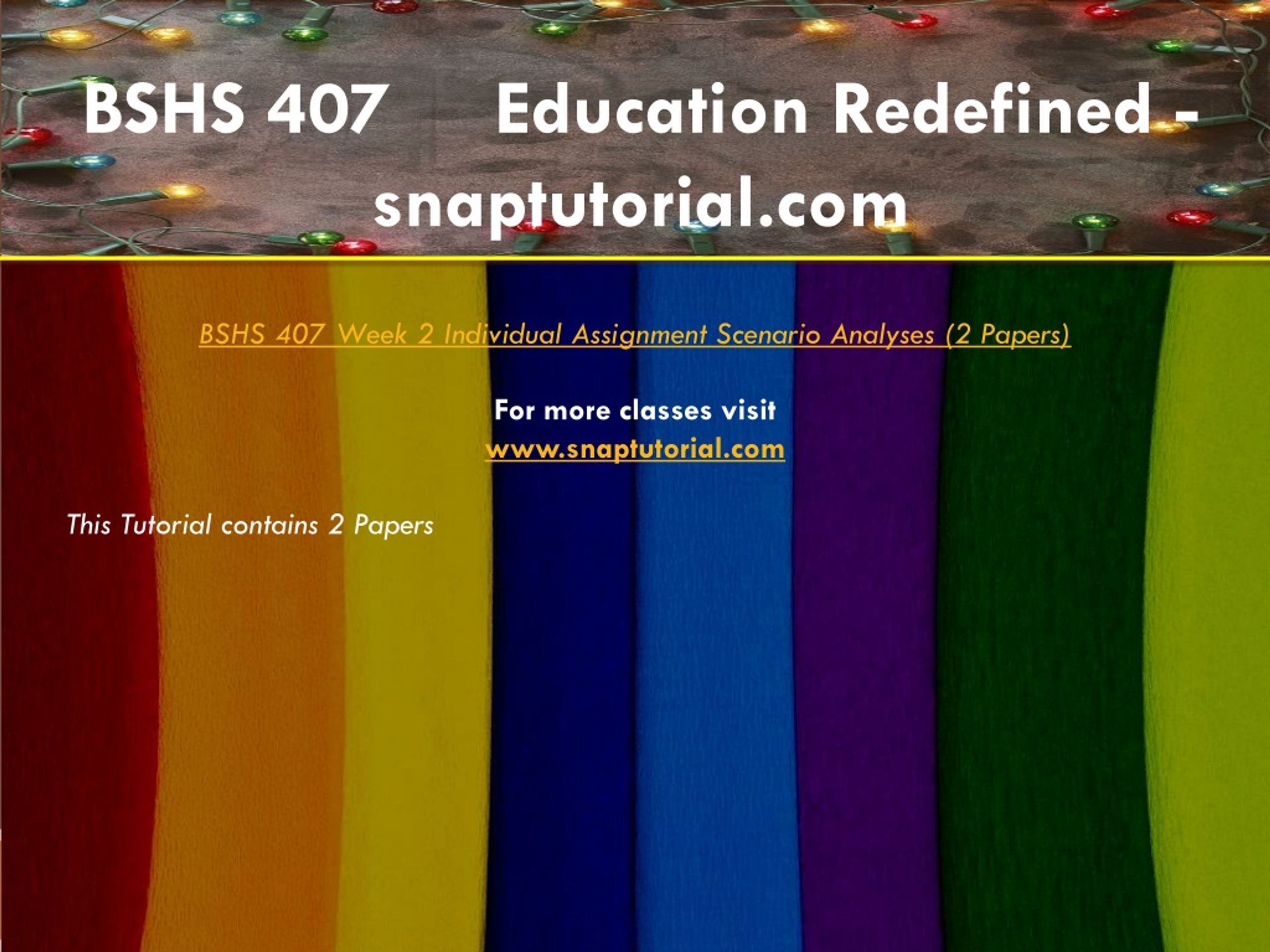 BSHS 407 Education Redefined - snaptutorial.com BSHS 407 Week 2 Individual Assignment Scenario Analyses (2 Papers) For more classes visit www.snaptutorial.com This Tutorial contains 2 Papers