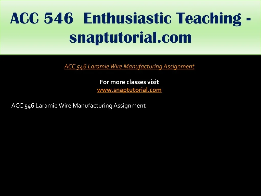 ACC 546 Enthusiastic Teaching - snaptutorial.com ACC 546 Laramie Wire Manufacturing Assignment For more classes visit www.snaptutorial.com ACC 546 Laramie Wire Manufacturing Assignment