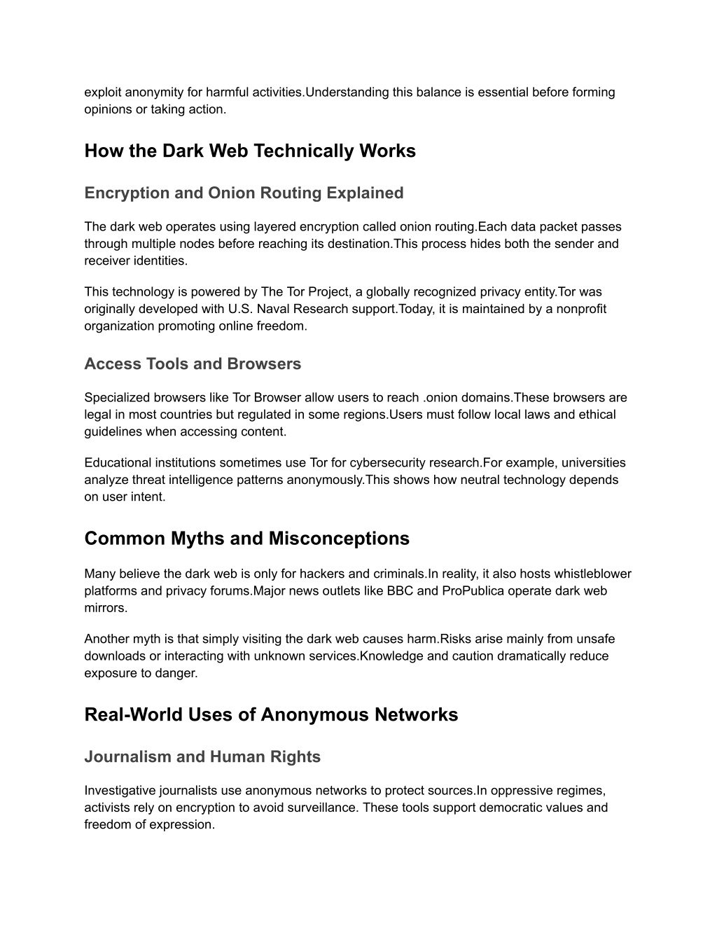 exploit anonymity for harmful activities.Understanding this balance is essential before forming opinions or taking action. How the Dark Web Technically Works Encryption and Onion Routing Explained The dark web operates using layered encryption called onion routing.Each data packet passes through multiple nodes before reaching its destination.This process hides both the sender and receiver identities. This technology is powered by The Tor Project, a globally recognized privacy entity.Tor was originally developed with U.S. Naval Research support.Today, it is maintained by a nonprofit organization promoting online freedom. Access Tools and Browsers Specialized browsers like Tor Browser allow users to reach .onion domains.These browsers are legal in most countries but regulated in some regions.Users must follow local laws and ethical guidelines when accessing content. Educational institutions sometimes use Tor for cybersecurity research.For example, universities analyze threat intelligence patterns anonymously.This shows how neutral technology depends on user intent. Common Myths and Misconceptions Many believe the dark web is only for hackers and criminals.In reality, it also hosts whistleblower platforms and privacy forums.Major news outlets like BBC and ProPublica operate dark web mirrors. Another myth is that simply visiting the dark web causes harm.Risks arise mainly from unsafe downloads or interacting with unknown services.Knowledge and caution dramatically reduce exposure to danger. Real-World Uses of Anonymous Networks Journalism and Human Rights Investigative journalists use anonymous networks to protect sources.In oppressive regimes, activists rely on encryption to avoid surveillance. These tools support democratic values and freedom of expression.