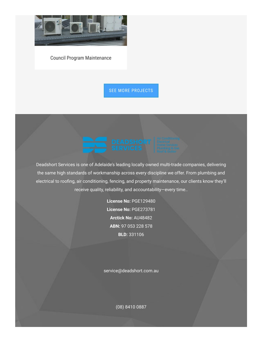 Council Program Maintenance SEE MORE PROJECTS Deadshort Services is one of Adelaide’s leading locally owned multi-trade companies, delivering the same high standards of workmanship across every discipline we offer. From plumbing and electrical to roo?ng, air conditioning, fencing, and property maintenance, our clients know they’ll receive quality, reliability, and accountability—every time.. License No: PGE129480 License No: PGE273781 Arctick No: AU48482 ABN: 97 053 228 578 BLD: 331106 service@deadshort.com.au (08) 8410 0887
