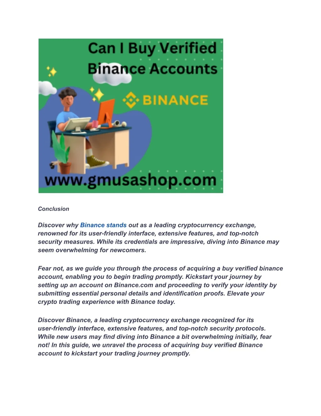 Contact Us / 24 Hours Reply Telegram: @gmusashop WhatsApp: +1 (385)237-5318 Email: gmusashop@gamil.com https://gmusashop.com/product/buy-verified-binance-account/ Buy Verified Binance Account If you run an online business, you might wonder why you should buy verified Binance account. Let’s look at why it’s important. First, when you buy a verified Binance account, you save time. Setting up and verifying a new account can take days or even weeks. But when you buy one that’s already verified, you can start using it right away. Security is another big reason to buy verified Binance account. These accounts have already passed Binance’s strict checks. This means they’re safer to use and less likely to get shut down. Trading limits are higher on verified accounts. When you buy a verified Binance account, you can trade more money at once. This is great if your business deals with large amounts. Some people buy verified Binance accounts to separate their business from their trades. It’s a smart way to organize your money. Lastly, when you buy a verified Binance account, you get access to all of Binance’s features right away. You don’t have to wait to use advanced tools that could help your business grow. If you want to save time, stay safe, trade more, and use all of Binance’s tools, you should think about buying a verified account. It’s a smart move for many online businesses. How to verify a Binance Accounts?