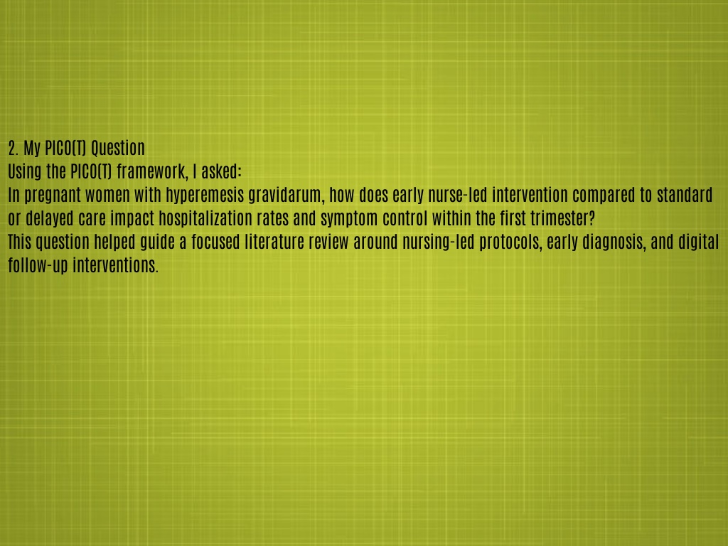 2. My PICO(T) Question Using the PICO(T) framework, I asked: In pregnant women with hyperemesis gravidarum, how does early nurse-led intervention compared to standard or delayed care impact hospitalization rates and symptom control within the first trimester? This question helped guide a focused literature review around nursing-led protocols, early diagnosis, and digital follow-up interventions.