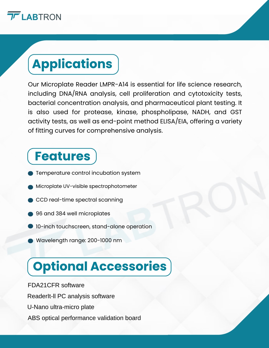 Applications Our Microplate Reader LMPR-A14 is essential for life science research, including DNA/RNA analysis, cell proliferation and cytotoxicity tests, bacterial concentration analysis, and pharmaceutical plant testing. It is also used for protease, kinase, phospholipase, NADH, and GST activity tests, as well as end-point method ELISA/EIA, offering a variety of fitting curves for comprehensive analysis. Features Temperature control incubation system Microplate UV-visible spectrophotometer CCD real-time spectral scanning 96 and 384 well microplates 10-inch touchscreen, stand-alone operation Wavelength range: 200-1000 nm Optional Accessories FDA21CFR software ReaderIt-ll PC analysis software U-Nano ultra-micro plate ABS optical performance validation board