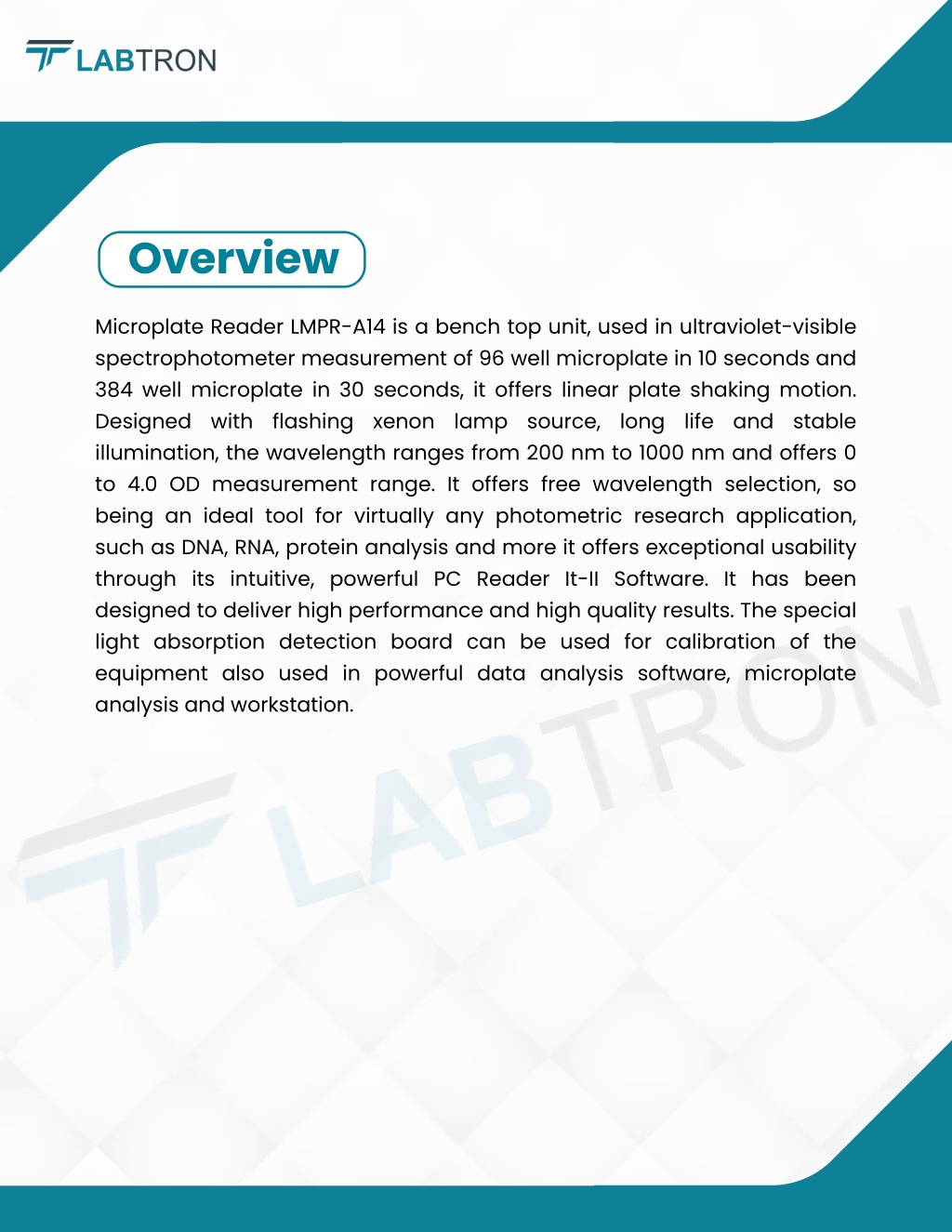 Overview Microplate Reader LMPR-A14 is a bench top unit, used in ultraviolet-visible spectrophotometer measurement of 96 well microplate in 10 seconds and 384 well microplate in 30 seconds, it offers linear plate shaking motion. Designed with flashing xenon lamp source, long life and stable illumination, the wavelength ranges from 200 nm to 1000 nm and offers 0 to 4.0 OD measurement range. It offers free wavelength selection, so being an ideal tool for virtually any photometric research application, such as DNA, RNA, protein analysis and more it offers exceptional usability through its intuitive, powerful PC Reader It-II Software. It has been designed to deliver high performance and high quality results. The special light absorption detection board can be used for calibration of the equipment also used in powerful data analysis software, microplate analysis and workstation.
