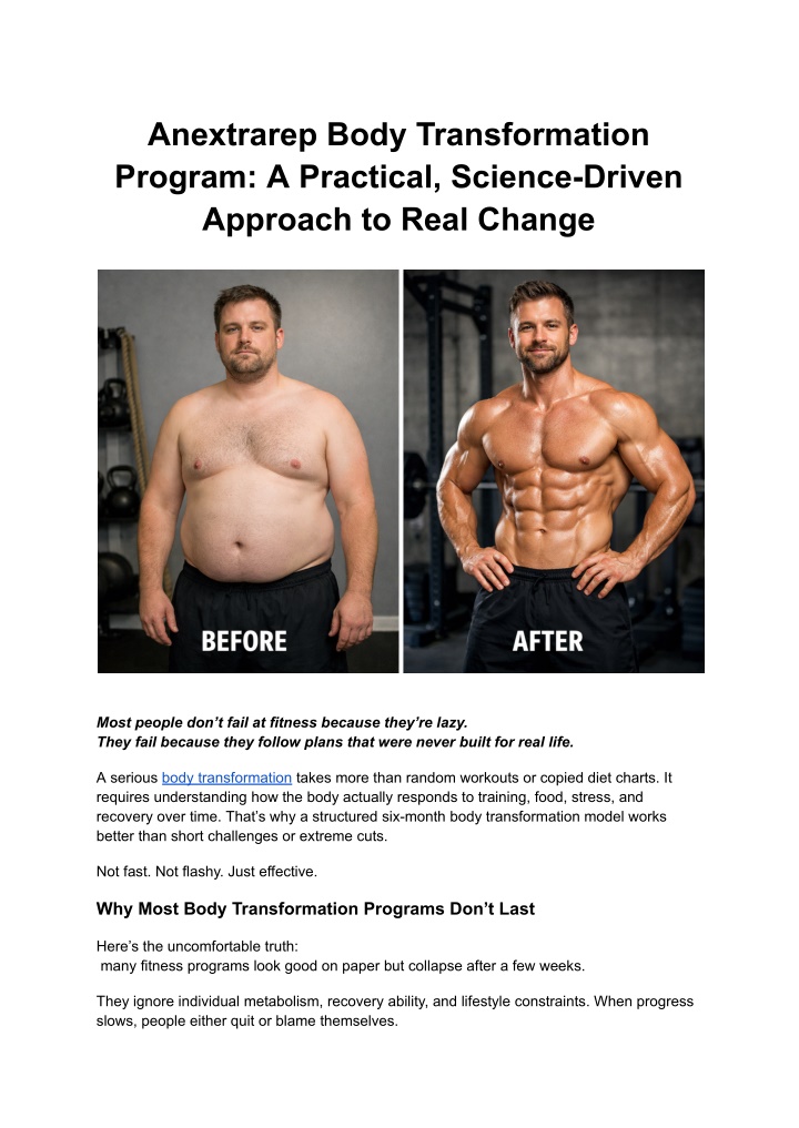 Anextrarep Body Transformation Program: A Practical, Science-Driven Approach to Real Change Most people don’t fail at fitness because they’re lazy. They fail because they follow plans that were never built for real life. A serious body transformation takes more than random workouts or copied diet charts. It requires understanding how the body actually responds to training, food, stress, and recovery over time. That’s why a structured six-month body transformation model works better than short challenges or extreme cuts. Not fast. Not flashy. Just effective. Why Most Body Transformation Programs Don’t Last Here’s the uncomfortable truth: many fitness programs look good on paper but collapse after a few weeks. They ignore individual metabolism, recovery ability, and lifestyle constraints. When progress slows, people either quit or blame themselves.