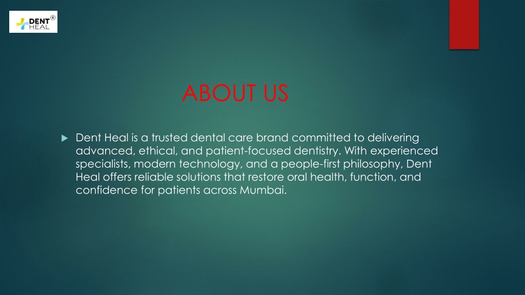 ABOUT US • Dent Heal is a trusted dental care brand committed to delivering advanced, ethical, and patient-focused dentistry. With experienced specialists, modern technology, and a people-first philosophy, Dent Heal offers reliable solutions that restore oral health, function, and confidence for patients across Mumbai.