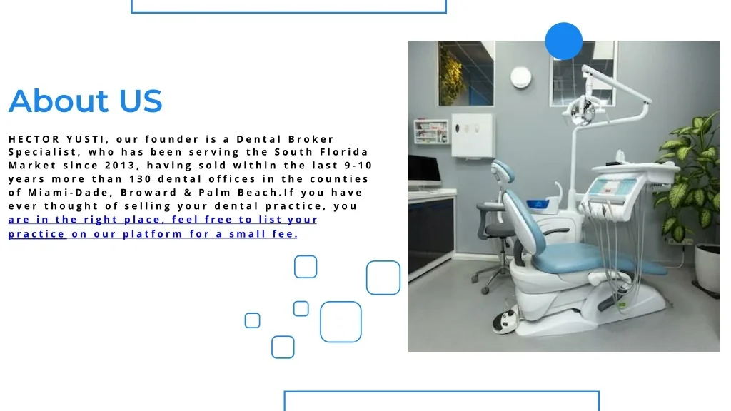 HECTOR YUSTI, our founder isa Dental Broker Specialist, whohas been serving the South Florida Market since 2013, havingsold within the last 9-10 years more than 130 dental offices in the counties of Miami-Dade, Broward& Palm Beach.If you have ever thought ofselling your dental practice, you are in the right place, feel free tolistyour practice on our platform fora small fee. AboutUS