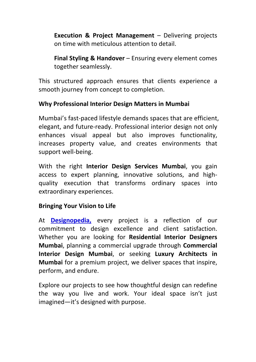 Execution & Project Management – Delivering projects on time with meticulous attention to detail. Final Styling & Handover – Ensuring every element comes together seamlessly. This structured approach ensures that clients experience a smooth journey from concept to completion. Why Professional Interior Design Matters in Mumbai Mumbai’s fast-paced lifestyle demands spaces that are efficient, elegant, and future-ready. Professional interior design not only enhances visual appeal but also improves functionality, increases property value, and creates environments that support well-being. With the right Interior Design Services Mumbai, you gain access to expert planning, innovative solutions, and high- quality execution that transforms ordinary spaces into extraordinary experiences. Bringing Your Vision to Life At Designopedia, every project is a reflection of our commitment to design excellence and client satisfaction. Whether you are looking for Residential Interior Designers Mumbai, planning a commercial upgrade through Commercial Interior Design Mumbai, or seeking Luxury Architects in Mumbai for a premium project, we deliver spaces that inspire, perform, and endure. Explore our projects to see how thoughtful design can redefine the way you live and work. Your ideal space isn’t just imagined—it’s designed with purpose.
