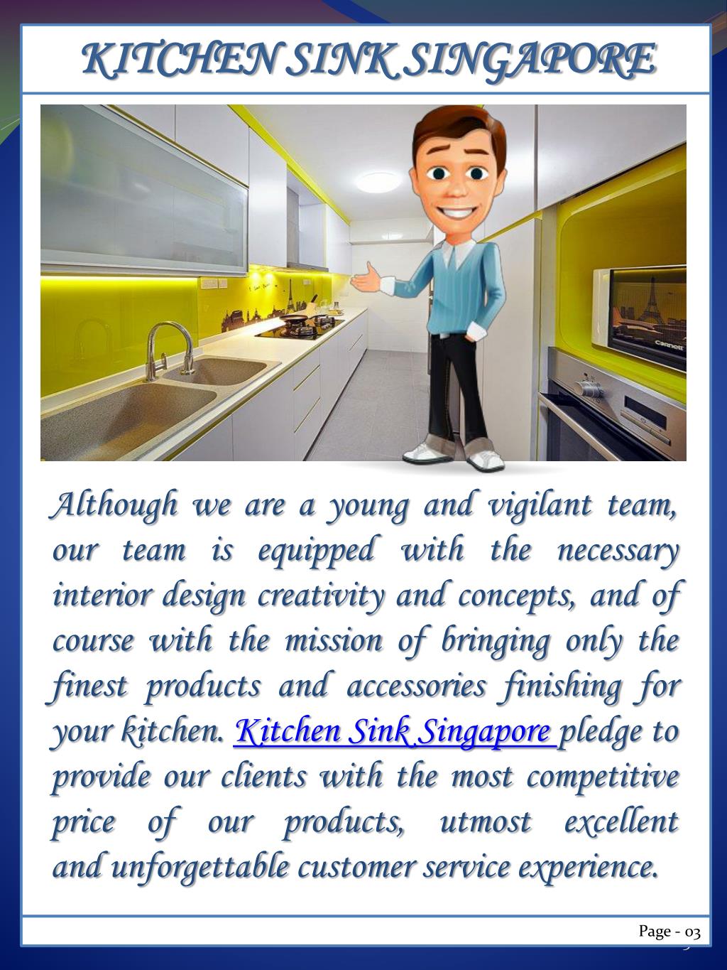 KITCHEN SINK SINGAPORE Although we are a young and vigilant team, our team is equipped with the necessary interior design creativity and concepts, and of course with the mission of bringing only the finest products and accessories finishing for your kitchen. Kitchen Sink Singaporepledge to provide our clients with the most competitive price of our products, utmost excellent and unforgettable customer service experience. Page - 03