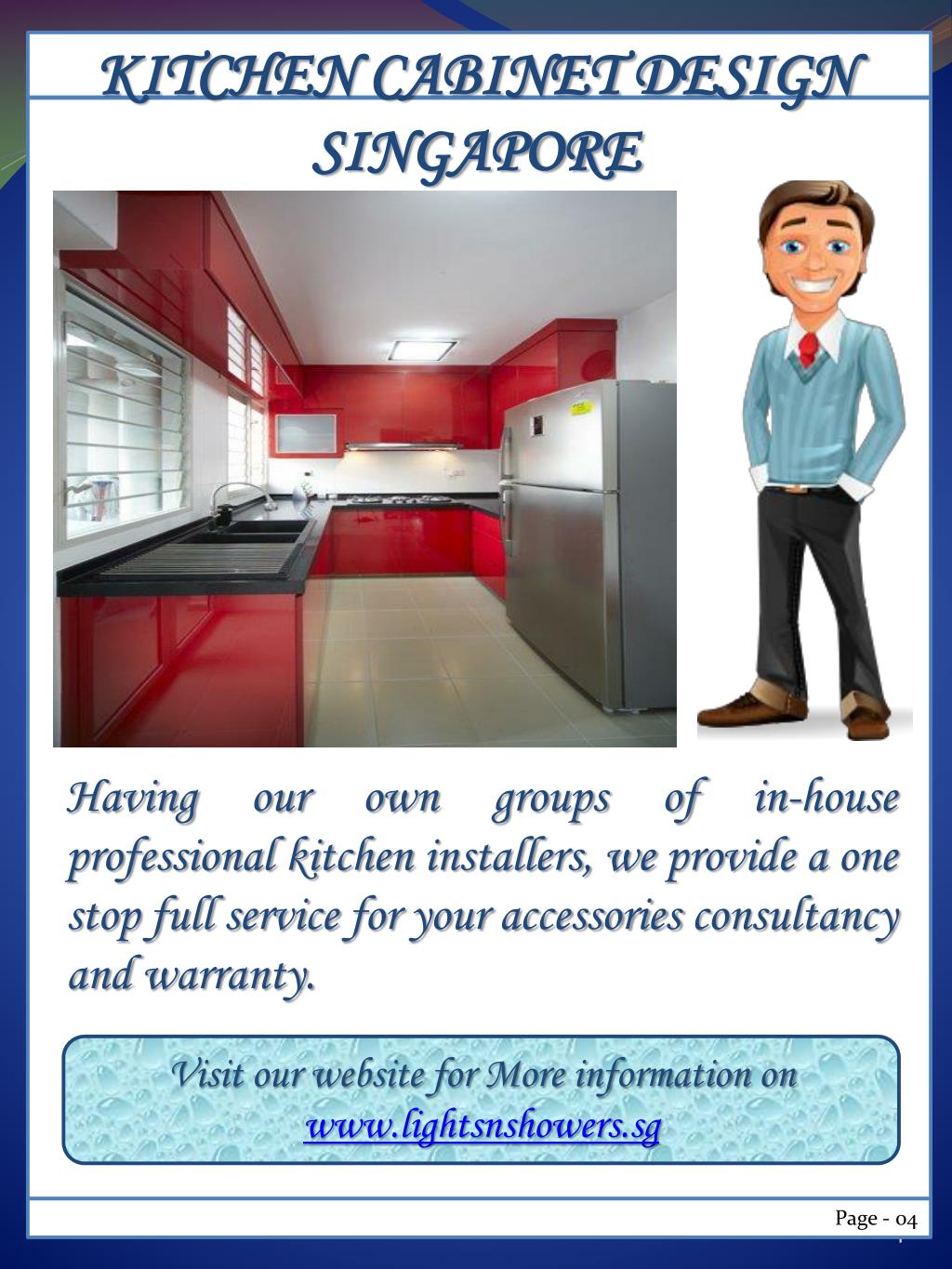 KITCHEN CABINET DESIGN SINGAPORE Having our own groups of in-house professional kitchen installers, we provide a one stop full service for your accessories consultancy and warranty. Visit our website for More information on www.lightsnshowers.sg Page - 04