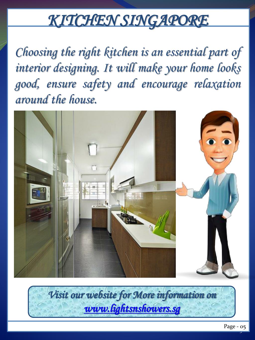 KITCHEN SINGAPORE Choosing the right kitchen is an essential part of interior designing. It will make your home looks good, ensure safety and encourage relaxation around the house. Visit our website for More information on www.lightsnshowers.sg Page - 05