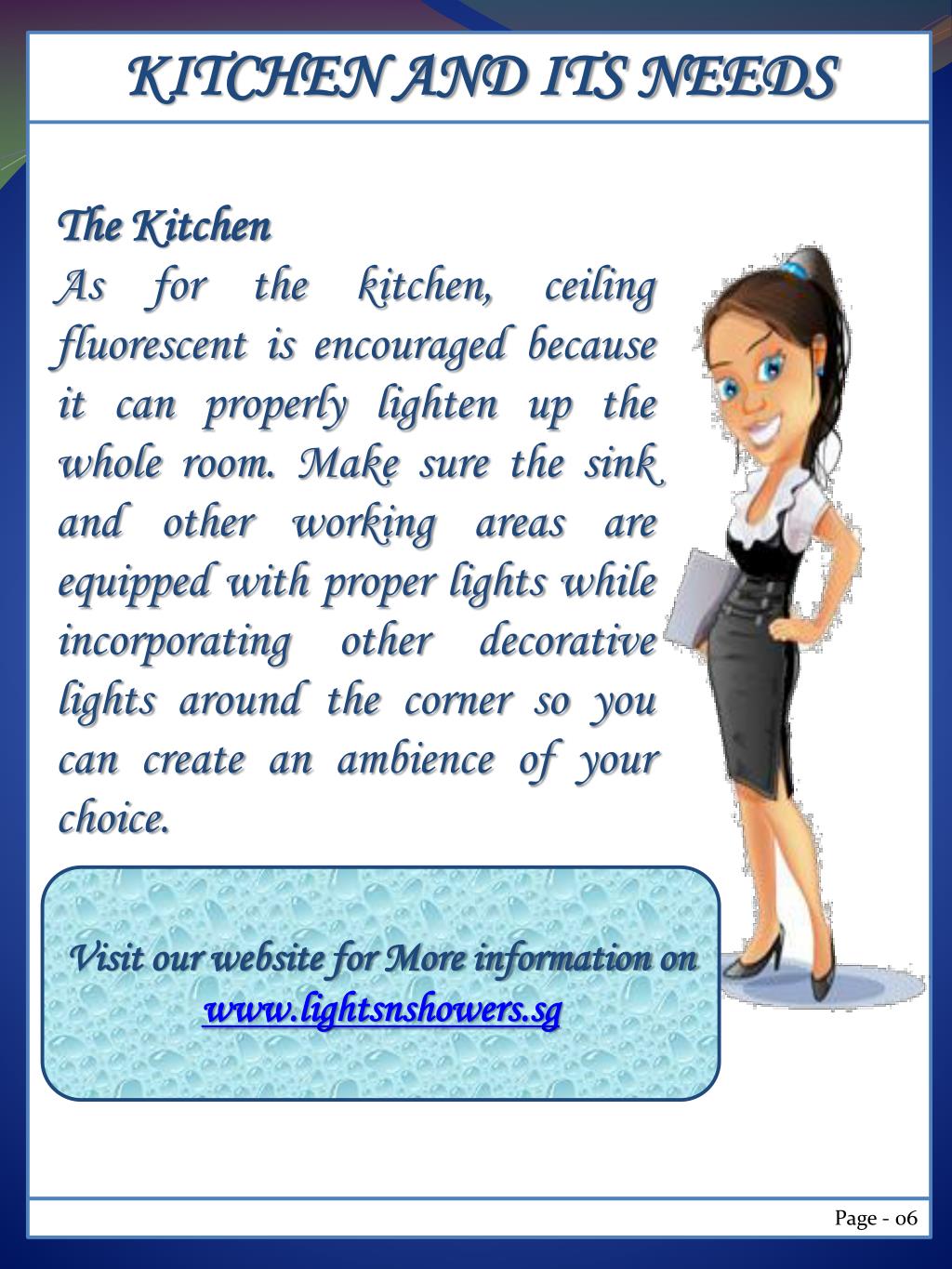 KITCHEN AND ITS NEEDS The Kitchen As for the kitchen, ceiling fluorescent is encouraged because it can properly lighten up the whole room. Make sure the sink and other working areas are equipped with proper lights while incorporating other decorative lights around the corner so you can create an ambience of your choice. Visit our website for More information on www.lightsnshowers.sg Page - 06