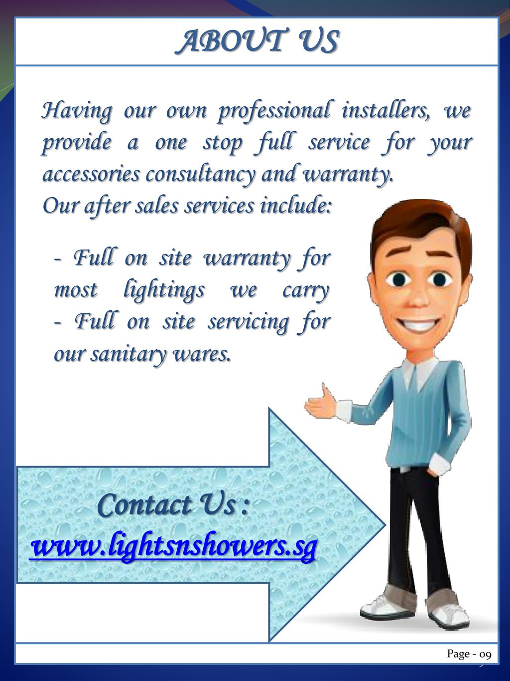 ABOUT US Having our own professional installers, we provide a one stop full service for your accessories consultancy and warranty. Our after sales services include: - Full on site warranty for most lightings we carry- Full on site servicing for our sanitary wares. Contact Us : www.lightsnshowers.sg Page - 09