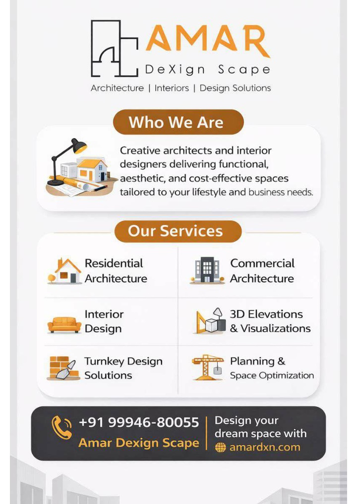 Amar DeXign Scape is an architecture and interior design studio specializing in residential and commercial spaces. We deliver end-to-end solutions in architecture, construction, and interiors with a strong focus on quality, innovation, and practical design. From concept to execution, we transform spaces into functional and elegant environments.