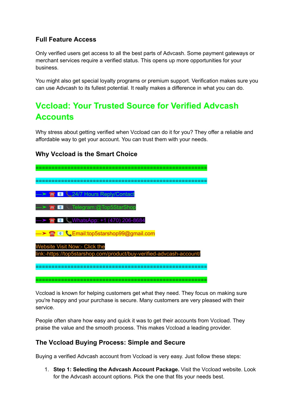 Full Feature Access Only verified users get access to all the best parts of Advcash. Some payment gateways or merchant services require a verified status. This opens up more opportunities for your business. You might also get special loyalty programs or premium support. Verification makes sure you can use Advcash to its fullest potential. It really makes a difference in what you can do. Vccload: Your Trusted Source for Verified Advcash Accounts Why stress about getting verified when Vccload can do it for you? They offer a reliable and affordable way to get your account. You can trust them with your needs. Why Vccload is the Smart Choice ====================================================== ====================================================== ––➤☎??24/7 Hours Reply/Contact ––➤☎??Telegram:@Top5StarShop ––➤☎??WhatsApp: +1 (470) 206-8684 ––➤☎??Email:top5starshop99@gmail.com Website Visit Now:- Click the link:-https://top5starshop.com/product/buy-verified-advcash-account/ ====================================================== ====================================================== Vccload is known for helping customers get what they need. They focus on making sure you're happy and your purchase is secure. Many customers are very pleased with their service. People often share how easy and quick it was to get their accounts from Vccload. They praise the value and the smooth process. This makes Vccload a leading provider. The Vccload Buying Process: Simple and Secure Buying a verified Advcash account from Vccload is very easy. Just follow these steps: 1. Step 1: Selecting the Advcash Account Package. Visit the Vccload website. Look for the Advcash account options. Pick the one that fits your needs best.