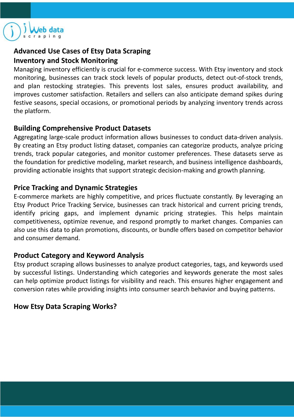 3. Advanced Use Cases of Etsy Data Scraping Inventory and Stock Monitoring Managing inventory efficiently is crucial for e-commerce success. With Etsy inventory and stock monitoring, businesses can track stock levels of popular products, detect out-of-stock trends, and plan restocking strategies. This prevents lost sales, ensures product availability, and improves customer satisfaction. Retailers and sellers can also anticipate demand spikes during festive seasons, special occasions, or promotional periods by analyzing inventory trends across the platform. Building Comprehensive Product Datasets Aggregating large-scale product information allows businesses to conduct data-driven analysis. By creating an Etsy product listing dataset, companies can categorize products, analyze pricing trends, track popular categories, and monitor customer preferences. These datasets serve as the foundation for predictive modeling, market research, and business intelligence dashboards, providing actionable insights that support strategic decision-making and growth planning. Price Tracking and Dynamic Strategies E-commerce markets are highly competitive, and prices fluctuate constantly. By leveraging an Etsy Product Price Tracking Service, businesses can track historical and current pricing trends, identify pricing gaps, and implement dynamic pricing strategies. This helps maintain competitiveness, optimize revenue, and respond promptly to market changes. Companies can also use this data to plan promotions, discounts, or bundle offers based on competitor behavior and consumer demand. Product Category and Keyword Analysis Etsy product scraping allows businesses to analyze product categories, tags, and keywords used by successful listings. Understanding which categories and keywords generate the most sales can help optimize product listings for visibility and reach. This ensures higher engagement and conversion rates while providing insights into consumer search behavior and buying patterns. How Etsy Data Scraping Works?