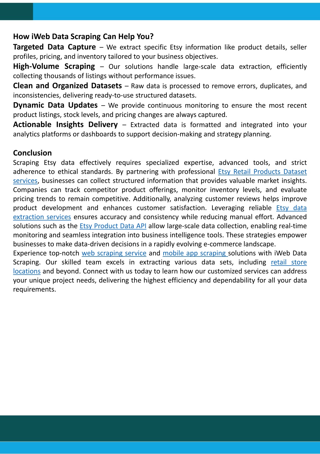 7. How iWeb Data Scraping Can Help You? Targeted Data Capture – We extract specific Etsy information like product details, seller profiles, pricing, and inventory tailored to your business objectives. High-Volume Scraping – Our solutions handle large-scale data extraction, efficiently collecting thousands of listings without performance issues. Clean and Organized Datasets – Raw data is processed to remove errors, duplicates, and inconsistencies, delivering ready-to-use structured datasets. Dynamic Data Updates – We provide continuous monitoring to ensure the most recent product listings, stock levels, and pricing changes are always captured. Actionable Insights Delivery – Extracted data is formatted and integrated into your analytics platforms or dashboards to support decision-making and strategy planning. Conclusion Scraping Etsy data effectively requires specialized expertise, advanced tools, and strict adherence to ethical standards. By partnering with professional Etsy Retail Products Dataset services, businesses can collect structured information that provides valuable market insights. Companies can track competitor product offerings, monitor inventory levels, and evaluate pricing trends to remain competitive. Additionally, analyzing customer reviews helps improve product development and enhances customer satisfaction. Leveraging reliable Etsy data extraction services ensures accuracy and consistency while reducing manual effort. Advanced solutions such as the Etsy Product Data API allow large-scale data collection, enabling real-time monitoring and seamless integration into business intelligence tools. These strategies empower businesses to make data-driven decisions in a rapidly evolving e-commerce landscape. Experience top-notch web scraping service and mobile app scraping solutions with iWeb Data Scraping. Our skilled team excels in extracting various data sets, including retail store locations and beyond. Connect with us today to learn how our customized services can address your unique project needs, delivering the highest efficiency and dependability for all your data requirements.