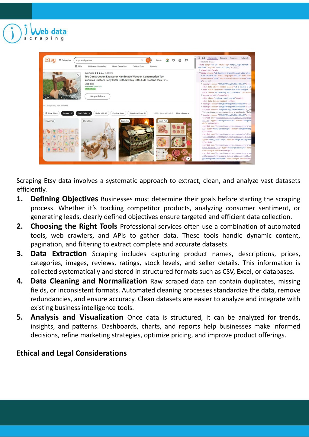 4. Scraping Etsy data involves a systematic approach to extract, clean, and analyze vast datasets efficiently. 1. Defining Objectives Businesses must determine their goals before starting the scraping process. Whether it’s tracking competitor products, analyzing consumer sentiment, or generating leads, clearly defined objectives ensure targeted and efficient data collection. 2. Choosing the Right Tools Professional services often use a combination of automated tools, web crawlers, and APIs to gather data. These tools handle dynamic content, pagination, and filtering to extract complete and accurate datasets. 3. Data Extraction Scraping includes capturing product names, descriptions, prices, categories, images, reviews, ratings, stock levels, and seller details. This information is collected systematically and stored in structured formats such as CSV, Excel, or databases. 4. Data Cleaning and Normalization Raw scraped data can contain duplicates, missing fields, or inconsistent formats. Automated cleaning processes standardize the data, remove redundancies, and ensure accuracy. Clean datasets are easier to analyze and integrate with existing business intelligence tools. 5. Analysis and Visualization Once data is structured, it can be analyzed for trends, insights, and patterns. Dashboards, charts, and reports help businesses make informed decisions, refine marketing strategies, optimize pricing, and improve product offerings. Ethical and Legal Considerations