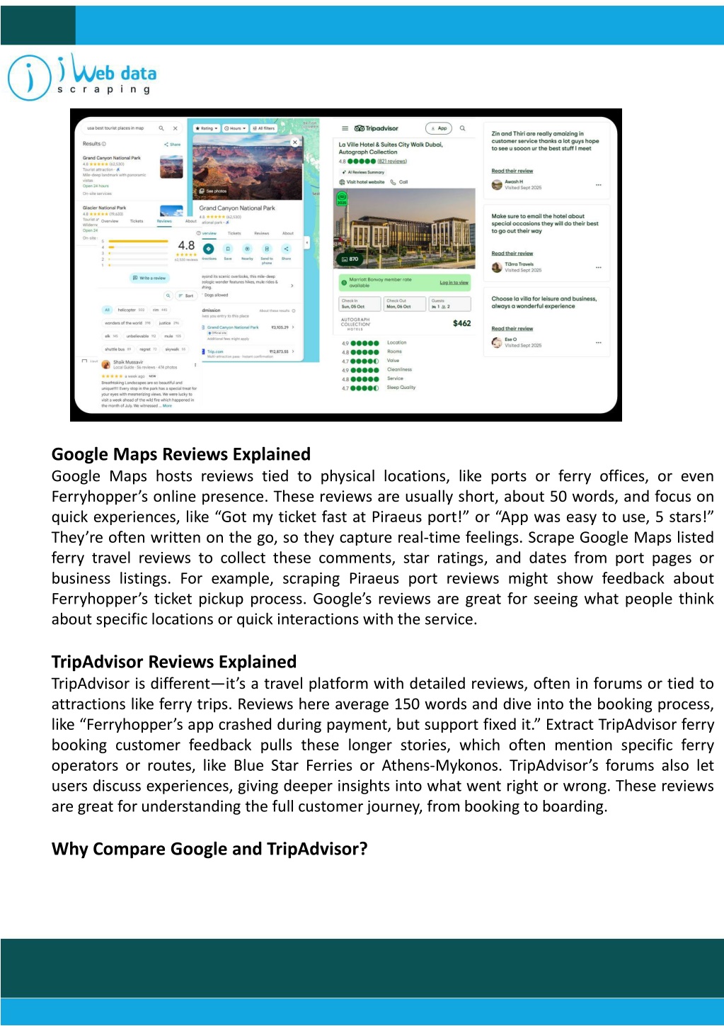 Google Maps Reviews Explained Google Maps hosts reviews tied to physical locations, like ports or ferry offices, or even Ferryhopper’s online presence. These reviews are usually short, about 50 words, and focus on quick experiences, like “Got my ticket fast at Piraeus port!” or “App was easy to use, 5 stars!” They’re often written on the go, so they capture real-time feelings. Scrape Google Maps listed ferry travel reviews to collect these comments, star ratings, and dates from port pages or business listings. For example, scraping Piraeus port reviews might show feedback about Ferryhopper’s ticket pickup process. Google’s reviews are great for seeing what people think about specific locations or quick interactions with the service. TripAdvisor Reviews Explained TripAdvisor is different—it’s a travel platform with detailed reviews, often in forums or tied to attractions like ferry trips. Reviews here average 150 words and dive into the booking process, like “Ferryhopper’s app crashed during payment, but support fixed it.” Extract TripAdvisor ferry booking customer feedback pulls these longer stories, which often mention specific ferry operators or routes, like Blue Star Ferries or Athens-Mykonos. TripAdvisor’s forums also let users discuss experiences, giving deeper insights into what went right or wrong. These reviews are great for understanding the full customer journey, from booking to boarding. Why Compare Google and TripAdvisor?