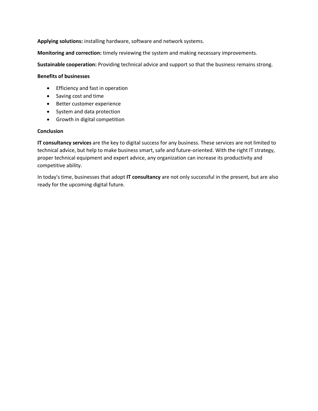 Applying solutions: installing hardware, software and network systems. Monitoring and correction: timely reviewing the system and making necessary improvements. Sustainable cooperation: Providing technical advice and support so that the business remains strong. Benefits of businesses Efficiency and fast in operation Saving cost and time Better customer experience System and data protection Growth in digital competition Conclusion IT consultancy services are the key to digital success for any business. These services are not limited to technical advice, but help to make business smart, safe and future-oriented. With the right IT strategy, proper technical equipment and expert advice, any organization can increase its productivity and competitive ability. In today's time, businesses that adopt IT consultancy are not only successful in the present, but are also ready for the upcoming digital future.