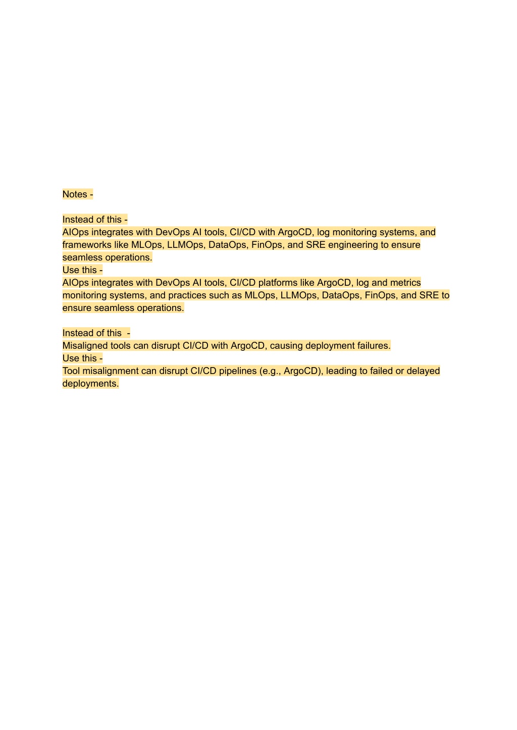 Notes - Instead of this - AIOps integrates with DevOps AI tools, CI/CD with ArgoCD, log monitoring systems, and frameworks like MLOps, LLMOps, DataOps, FinOps, and SRE engineering to ensure seamless operations. Use this - AIOps integrates with DevOps AI tools, CI/CD platforms like ArgoCD, log and metrics monitoring systems, and practices such as MLOps, LLMOps, DataOps, FinOps, and SRE to ensure seamless operations. Instead of this - Misaligned tools can disrupt CI/CD with ArgoCD, causing deployment failures. Use this - Tool misalignment can disrupt CI/CD pipelines (e.g., ArgoCD), leading to failed or delayed deployments.
