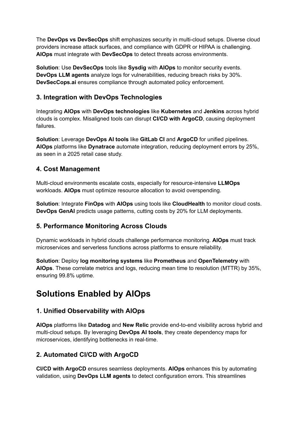 The DevOps vs DevSecOps shift emphasizes security in multi-cloud setups. Diverse cloud providers increase attack surfaces, and compliance with GDPR or HIPAA is challenging. AIOps must integrate with DevSecOps to detect threats across environments. Solution: Use DevSecOps tools like Sysdig with AIOps to monitor security events. DevOps LLM agents analyze logs for vulnerabilities, reducing breach risks by 30%. DevSecCops.ai ensures compliance through automated policy enforcement. 3. Integration with DevOps Technologies Integrating AIOps with DevOps technologies like Kubernetes and Jenkins across hybrid clouds is complex. Misaligned tools can disrupt CI/CD with ArgoCD, causing deployment failures. Solution: Leverage DevOps AI tools like GitLab CI and ArgoCD for unified pipelines. AIOps platforms like Dynatrace automate integration, reducing deployment errors by 25%, as seen in a 2025 retail case study. 4. Cost Management Multi-cloud environments escalate costs, especially for resource-intensive LLMOps workloads. AIOps must optimize resource allocation to avoid overspending. Solution: Integrate FinOps with AIOps using tools like CloudHealth to monitor cloud costs. DevOps GenAI predicts usage patterns, cutting costs by 20% for LLM deployments. 5. Performance Monitoring Across Clouds Dynamic workloads in hybrid clouds challenge performance monitoring. AIOps must track microservices and serverless functions across platforms to ensure reliability. Solution: Deploy log monitoring systems like Prometheus and OpenTelemetry with AIOps. These correlate metrics and logs, reducing mean time to resolution (MTTR) by 35%, ensuring 99.8% uptime. Solutions Enabled by AIOps 1. Unified Observability with AIOps AIOps platforms like Datadog and New Relic provide end-to-end visibility across hybrid and multi-cloud setups. By leveraging DevOps AI tools, they create dependency maps for microservices, identifying bottlenecks in real-time. 2. Automated CI/CD with ArgoCD CI/CD with ArgoCD ensures seamless deployments. AIOps enhances this by automating validation, using DevOps LLM agents to detect configuration errors. This streamlines