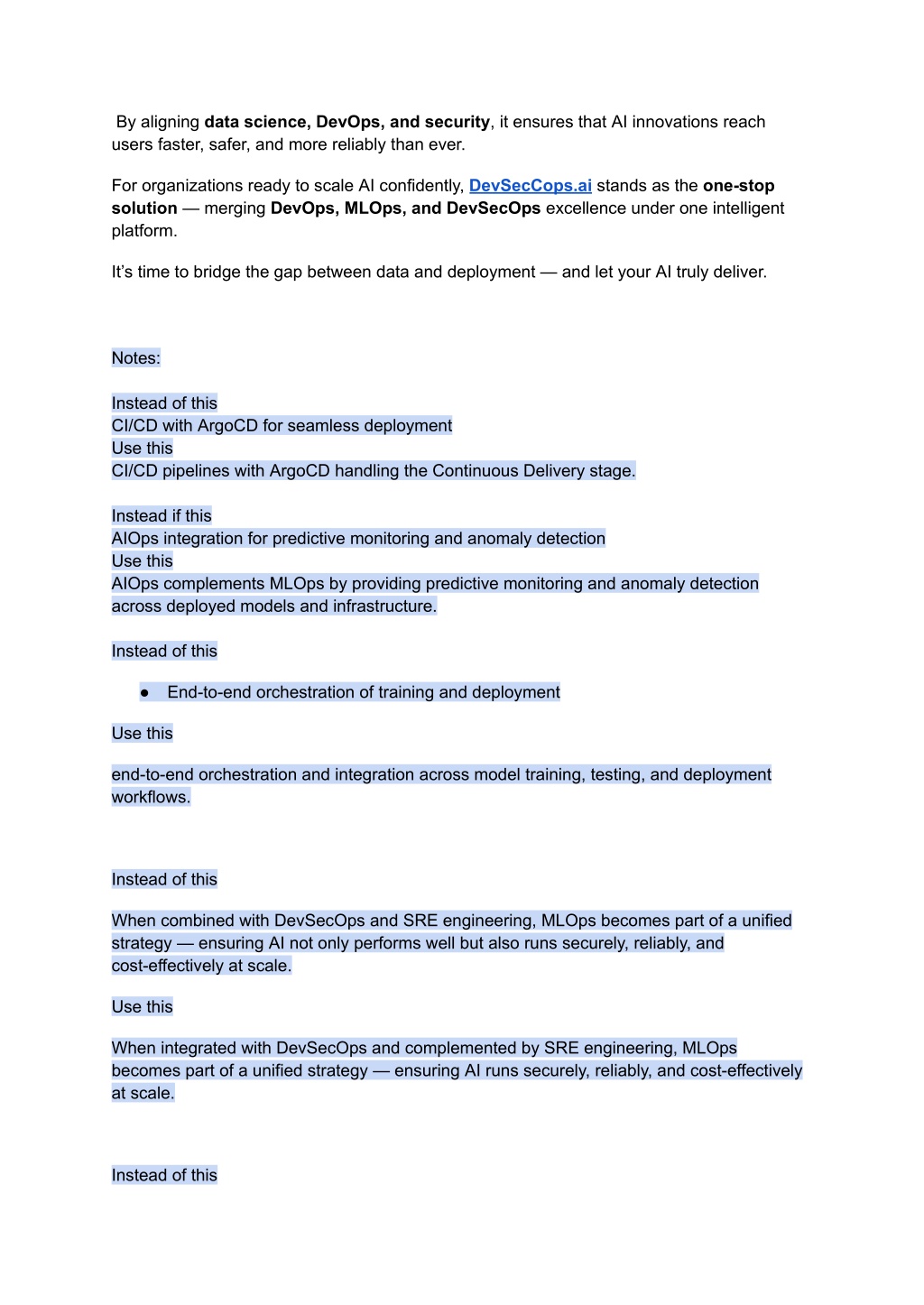 By aligning data science, DevOps, and security, it ensures that AI innovations reach users faster, safer, and more reliably than ever. For organizations ready to scale AI confidently, DevSecCops.ai stands as the one-stop solution — merging DevOps, MLOps, and DevSecOps excellence under one intelligent platform. It’s time to bridge the gap between data and deployment — and let your AI truly deliver. Notes: Instead of this CI/CD with ArgoCD for seamless deployment Use this CI/CD pipelines with ArgoCD handling the Continuous Delivery stage. Instead if this AIOps integration for predictive monitoring and anomaly detection Use this AIOps complements MLOps by providing predictive monitoring and anomaly detection across deployed models and infrastructure. Instead of this ● End-to-end orchestration of training and deployment Use this end-to-end orchestration and integration across model training, testing, and deployment workflows. Instead of this When combined with DevSecOps and SRE engineering, MLOps becomes part of a unified strategy — ensuring AI not only performs well but also runs securely, reliably, and cost-effectively at scale. Use this When integrated with DevSecOps and complemented by SRE engineering, MLOps becomes part of a unified strategy — ensuring AI runs securely, reliably, and cost-effectively at scale. Instead of this