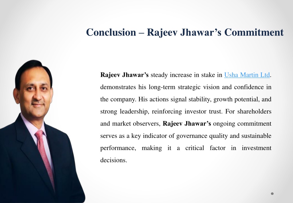 Conclusion – Rajeev Jhawar’s Commitment Rajeev Jhawar’ssteady increase in stake in Usha Martin Ltd. demonstrates his long-term strategic vision and confidence in the company. His actions signal stability, growth potential, and strong leadership, reinforcing investor trust. For shareholders and market observers, Rajeev Jhawar’songoing commitment serves as a key indicator of governance quality and sustainable performance, making it a critical factor in investment decisions.