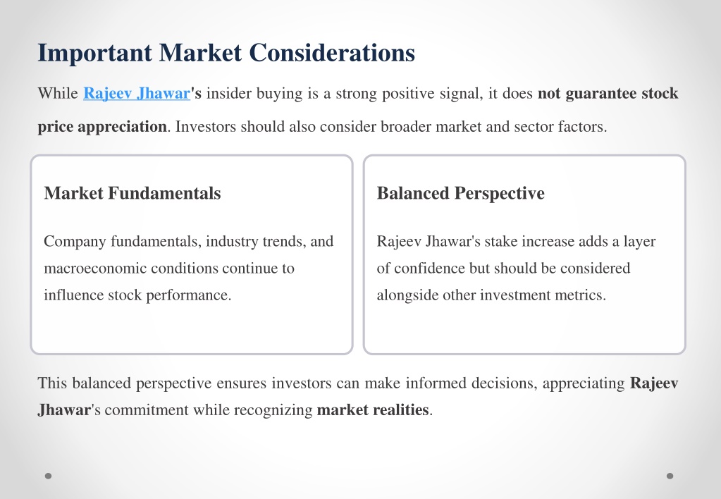 Important Market Considerations While Rajeev Jhawar'sinsider buying is a strong positive signal, it does not guarantee stock price appreciation. Investors should also consider broader market and sector factors. Market Fundamentals Balanced Perspective Company fundamentals, industry trends, and macroeconomic conditions continue to influence stock performance. Rajeev Jhawar's stake increase adds a layer of confidence but should be considered alongside other investment metrics. This balanced perspective ensures investors can make informed decisions, appreciating Rajeev Jhawar's commitment while recognizing market realities.