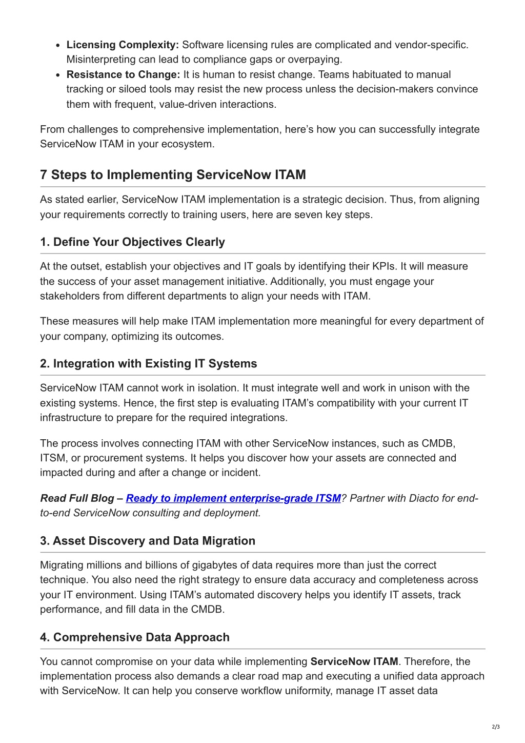 Licensing Complexity: Software licensing rules are complicated and vendor-specific. Misinterpreting can lead to compliance gaps or overpaying. Resistance to Change: It is human to resist change. Teams habituated to manual tracking or siloed tools may resist the new process unless the decision-makers convince them with frequent, value-driven interactions. From challenges to comprehensive implementation, here’s how you can successfully integrate ServiceNow ITAM in your ecosystem. 7 Steps to Implementing ServiceNow ITAM As stated earlier, ServiceNow ITAM implementation is a strategic decision. Thus, from aligning your requirements correctly to training users, here are seven key steps. 1. Define Your Objectives Clearly At the outset, establish your objectives and IT goals by identifying their KPIs. It will measure the success of your asset management initiative. Additionally, you must engage your stakeholders from different departments to align your needs with ITAM. These measures will help make ITAM implementation more meaningful for every department of your company, optimizing its outcomes. 2. Integration with Existing IT Systems ServiceNow ITAM cannot work in isolation. It must integrate well and work in unison with the existing systems. Hence, the first step is evaluating ITAM’s compatibility with your current IT infrastructure to prepare for the required integrations. The process involves connecting ITAM with other ServiceNow instances, such as CMDB, ITSM, or procurement systems. It helps you discover how your assets are connected and impacted during and after a change or incident. Read Full Blog – Ready to implement enterprise-grade ITSM? Partner with Diacto for end- to-end ServiceNow consulting and deployment. 3. Asset Discovery and Data Migration Migrating millions and billions of gigabytes of data requires more than just the correct technique. You also need the right strategy to ensure data accuracy and completeness across your IT environment. Using ITAM’s automated discovery helps you identify IT assets, track performance, and fill data in the CMDB. 4. Comprehensive Data Approach You cannot compromise on your data while implementing ServiceNow ITAM. Therefore, the implementation process also demands a clear road map and executing a unified data approach with ServiceNow. It can help you conserve workflow uniformity, manage IT asset data 2/3
