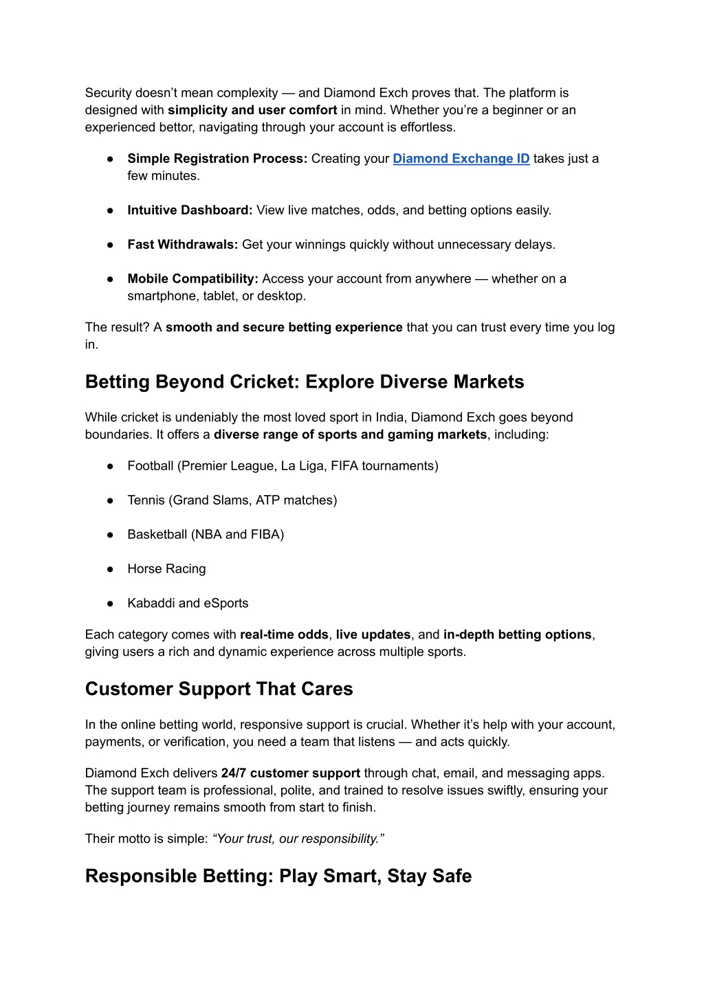 Security doesn’t mean complexity — and Diamond Exch proves that. The platform is designed with simplicity and user comfort in mind. Whether you’re a beginner or an experienced bettor, navigating through your account is effortless. ● Simple Registration Process: Creating your Diamond Exchange ID takes just a few minutes. ● Intuitive Dashboard: View live matches, odds, and betting options easily. ● Fast Withdrawals: Get your winnings quickly without unnecessary delays. ● Mobile Compatibility: Access your account from anywhere — whether on a smartphone, tablet, or desktop. The result? A smooth and secure betting experience that you can trust every time you log in. Betting Beyond Cricket: Explore Diverse Markets While cricket is undeniably the most loved sport in India, Diamond Exch goes beyond boundaries. It offers a diverse range of sports and gaming markets, including: ● Football (Premier League, La Liga, FIFA tournaments) ● Tennis (Grand Slams, ATP matches) ● Basketball (NBA and FIBA) ● Horse Racing ● Kabaddi and eSports Each category comes with real-time odds, live updates, and in-depth betting options, giving users a rich and dynamic experience across multiple sports. Customer Support That Cares In the online betting world, responsive support is crucial. Whether it’s help with your account, payments, or verification, you need a team that listens — and acts quickly. Diamond Exch delivers 24/7 customer support through chat, email, and messaging apps. The support team is professional, polite, and trained to resolve issues swiftly, ensuring your betting journey remains smooth from start to finish. Their motto is simple: “Your trust, our responsibility.” Responsible Betting: Play Smart, Stay Safe