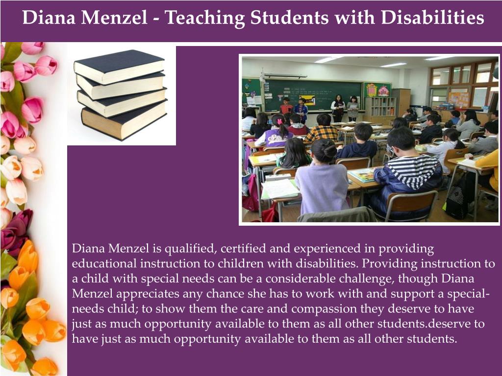 Diana Menzel - Teaching Students with Disabilities Diana Menzel is qualified, certified and experienced in providing educational instruction to children with disabilities. Providing instruction to a child with special needs can be a considerable challenge, though Diana Menzel appreciates any chance she has to work with and support a special-needs child; to show them the care and compassion they deserve to have just as much opportunity available to them as all other students.deserve to have just as much opportunity available to them as all other students.