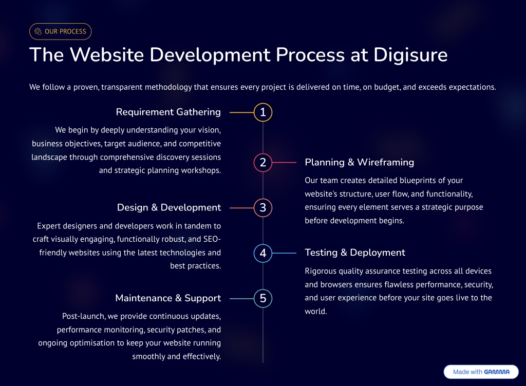 8. OUR PROCESS The Website Development Process at Digisure We follow a proven, transparent methodology that ensures every project is delivered on time, on budget, and exceeds expectations. 1 Requirement Gathering We begin by deeply understanding your vision, business objectives, target audience, and competitive landscape through comprehensive discovery sessions and strategic planning workshops. 2 Planning & Wireframing Our team creates detailed blueprints of your website's structure, user flow, and functionality, ensuring every element serves a strategic purpose before development begins. 3 Design & Development Expert designers and developers work in tandem to craft visually engaging, functionally robust, and SEO- friendly websites using the latest technologies and 4 Testing & Deployment best practices. Rigorous quality assurance testing across all devices and browsers ensures flawless performance, security, and user experience before your site goes live to the world. 5 Maintenance & Support Post-launch, we provide continuous updates, performance monitoring, security patches, and ongoing optimisation to keep your website running smoothly and effectively.