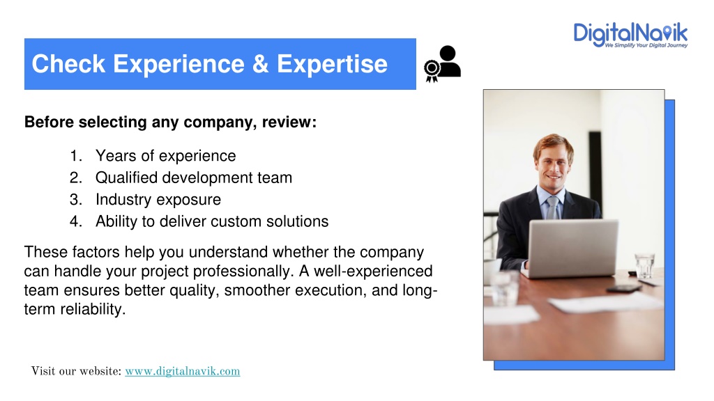 Check Experience & Expertise Before selecting any company, review: • Years of experience • Qualified development team • Industry exposure • Ability to deliver custom solutions These factors help you understand whether the company can handle your project professionally. A well-experienced team ensures better quality, smoother execution, and long-term reliability. Visit our website: www.digitalnavik.com