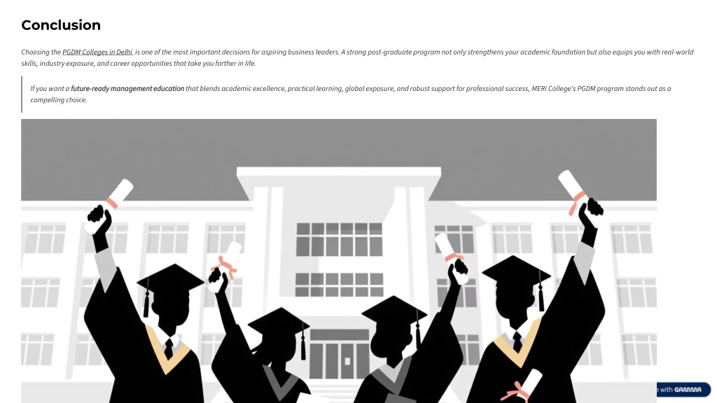 10. Conclusion Choosing the PGDM Colleges in Delhi is one of the most important decisions for aspiring business leaders. A strong post-graduate program not only strengthens your academic foundation but also equips you with real-world skills, industry exposure, and career opportunities that take you farther in life. If you want a future-ready management education that blends academic excellence, practical learning, global exposure, and robust support for professional success, MERI College's PGDM program stands out as a compelling choice.