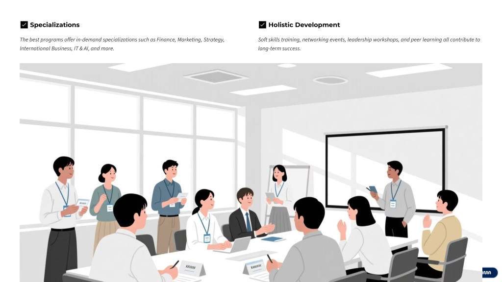 6. ✅ Specializations ✅ Holistic Development The best programs offer in-demand specializations such as Finance, Marketing, Strategy, International Business, IT & AI, and more. Soft skills training, networking events, leadership workshops, and peer learning all contribute to long-term success.