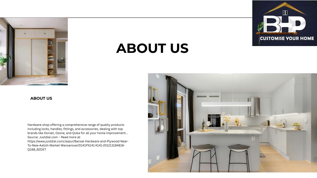 ABOUT US ABOUT US Hardware shop offering a comprehensive range of quality products including locks, handles, fittings, and accessories, dealing with top brands like Dorset, Ozone, and Quba for all your home improvement... Source: Justdial.com – Read more at: https://www.justdial.com/Jaipur/Bansal-Hardware-and-Plywood-Near- To-New-Aatish-Market-Mansarovar/0141PX141-X141-201213184816- Q1B8_BZDET