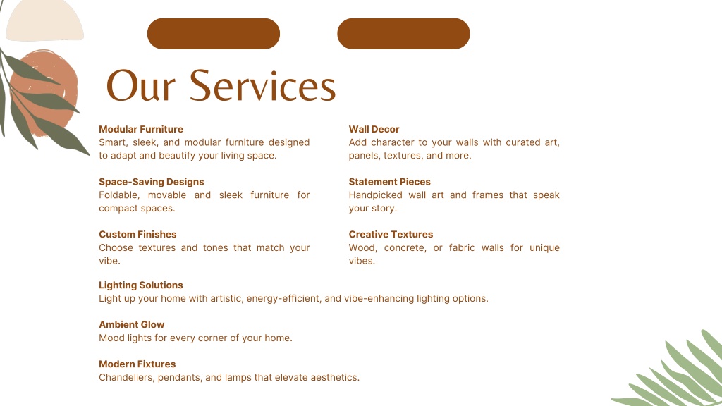 Our Services Modular Furniture Smart, sleek, and modular furniture designed to adapt and beautify your living space. Wall Decor Add character to your walls with curated art, panels, textures, and more. Space-Saving Designs Foldable, movable and sleek furniture for compact spaces. Statement Pieces Handpicked wall art and frames that speak your story. Custom Finishes Choose textures and tones that match your vibe. Creative Textures Wood, concrete, or fabric walls for unique vibes. Lighting Solutions Light up your home with artistic, energy-efficient, and vibe-enhancing lighting options. Ambient Glow Mood lights for every corner of your home. Modern Fixtures Chandeliers, pendants, and lamps that elevate aesthetics.