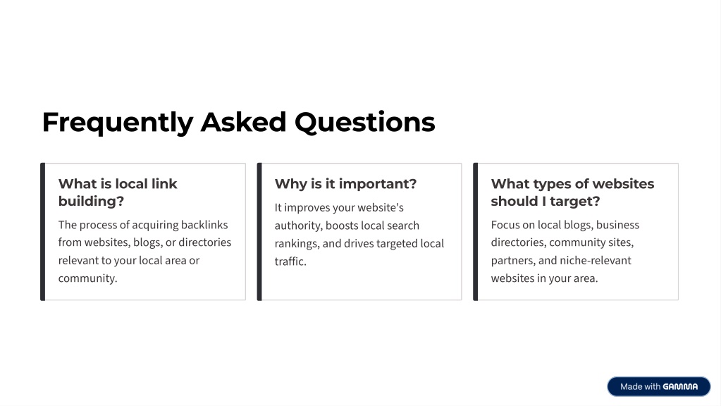 Frequently Asked Questions What is local link building? Why is it important? What types of websites should I target? It improves your website's authority, boosts local search rankings, and drives targeted local traffic. The process of acquiring backlinks from websites, blogs, or directories relevant to your local area or community. Focus on local blogs, business directories, community sites, partners, and niche-relevant websites in your area.