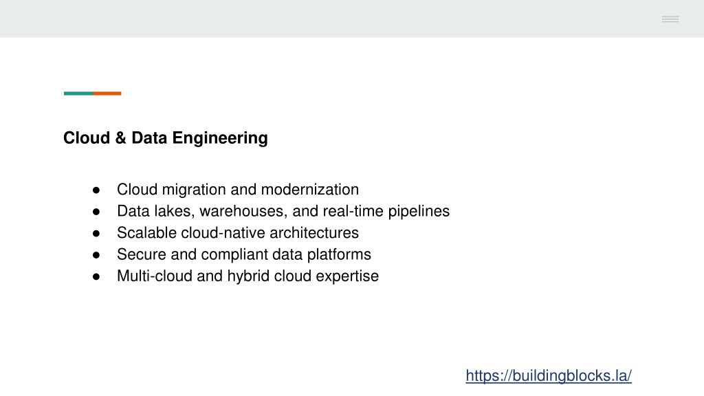 Cloud & Data Engineering • Cloud migration and modernization • Data lakes, warehouses, and real-time pipelines • Scalable cloud-native architectures • Secure and compliant data platforms • Multi-cloud and hybrid cloud expertise https://buildingblocks.la/