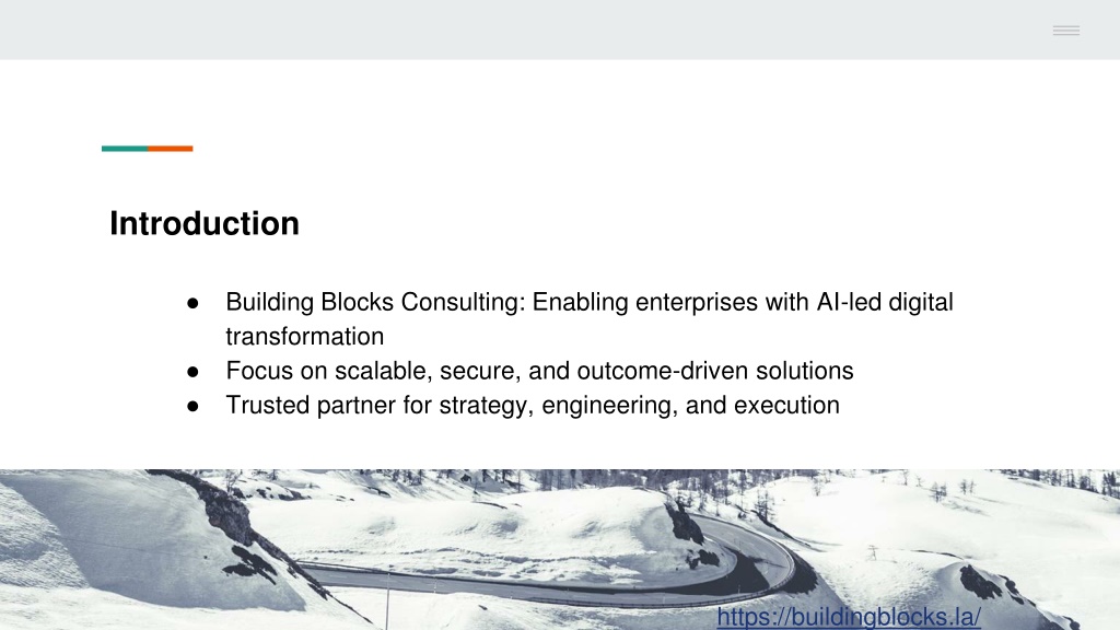 Introduction • Building Blocks Consulting: Enabling enterprises with AI-led digital transformation • Focus on scalable, secure, and outcome-driven solutions • Trusted partner for strategy, engineering, and execution https://buildingblocks.la/