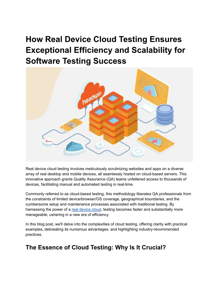 How Real Device Cloud Testing Ensures Exceptional Efficiency and Scalability for Software Testing Success Real device cloud testing involves meticulously scrutinizing websites and apps on a diverse array of real desktop and mobile devices, all seamlessly hosted on cloud-based servers. This innovative approach grants Quality Assurance (QA) teams unfettered access to thousands of devices, facilitating manual and automated testing in real-time. Commonly referred to as cloud-based testing, this methodology liberates QA professionals from the constraints of limited device/browser/OS coverage, geographical boundaries, and the cumbersome setup and maintenance processes associated with traditional testing. By harnessing the power of a real device cloud, testing becomes faster and substantially more manageable, ushering in a new era of efficiency. In this blog post, we'll delve into the complexities of cloud testing, offering clarity with practical examples, delineating its numerous advantages, and highlighting industry-recommended practices. The Essence of Cloud Testing: Why Is It Crucial?