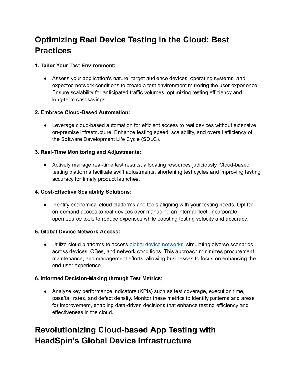 Optimizing Real Device Testing in the Cloud: Best Practices 1. Tailor Your Test Environment: ● Assess your application's nature, target audience devices, operating systems, and expected network conditions to create a test environment mirroring the user experience. Ensure scalability for anticipated traffic volumes, optimizing testing efficiency and long-term cost savings. 2. Embrace Cloud-Based Automation: ● Leverage cloud-based automation for efficient access to real devices without extensive on-premise infrastructure. Enhance testing speed, scalability, and overall efficiency of the Software Development Life Cycle (SDLC). 3. Real-Time Monitoring and Adjustments: ● Actively manage real-time test results, allocating resources judiciously. Cloud-based testing platforms facilitate swift adjustments, shortening test cycles and improving testing accuracy for timely product launches. 4. Cost-Effective Scalability Solutions: ● Identify economical cloud platforms and tools aligning with your testing needs. Opt for on-demand access to real devices over managing an internal fleet. Incorporate open-source tools to reduce expenses while boosting testing velocity and accuracy. 5. Global Device Network Access: ● Utilize cloud platforms to access global device networks, simulating diverse scenarios across devices, OSes, and network conditions. This approach minimizes procurement, maintenance, and management efforts, allowing businesses to focus on enhancing the end-user experience. 6. Informed Decision-Making through Test Metrics: ● Analyze key performance indicators (KPIs) such as test coverage, execution time, pass/fail rates, and defect density. Monitor these metrics to identify patterns and areas for improvement, enabling data-driven decisions that enhance testing efficiency and effectiveness in the cloud. Revolutionizing Cloud-based App Testing with HeadSpin's Global Device Infrastructure
