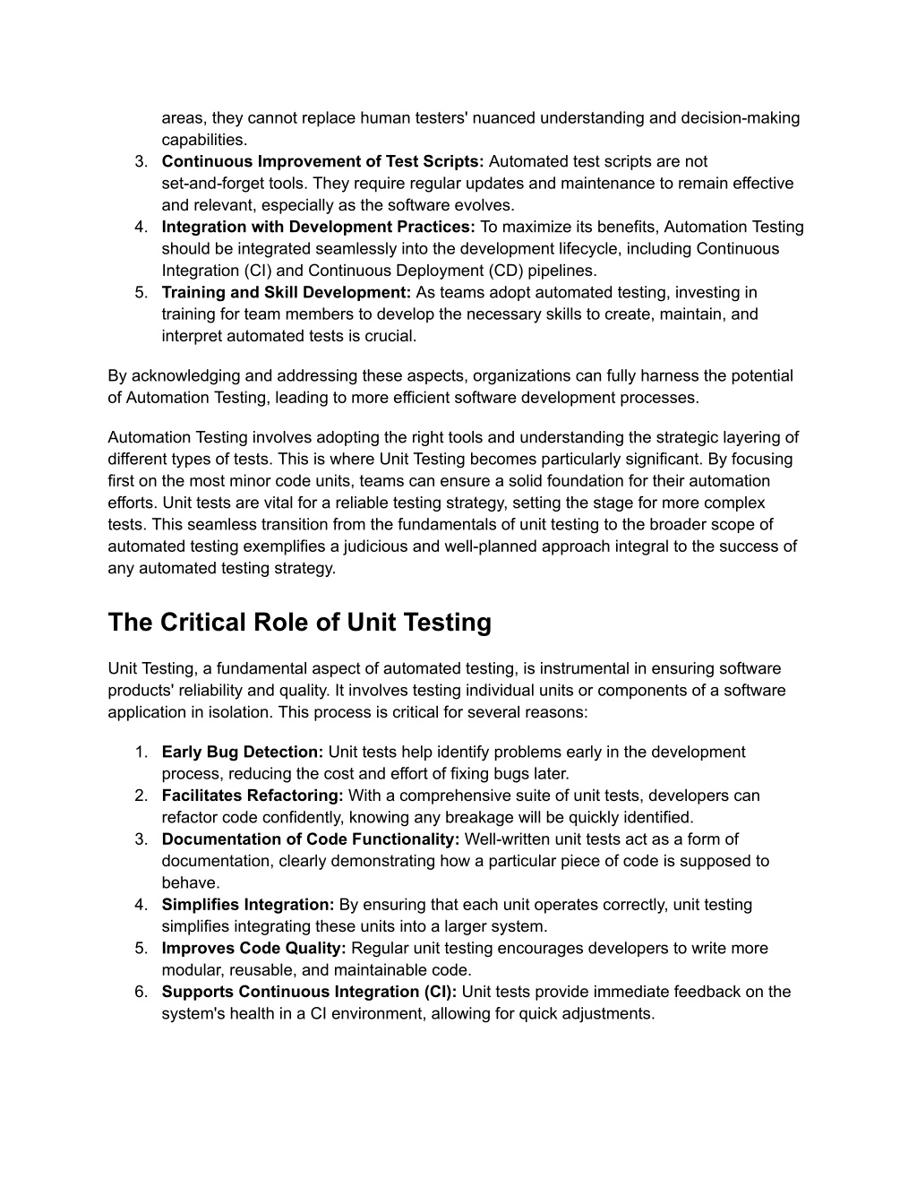 areas, they cannot replace human testers' nuanced understanding and decision-making capabilities. 3. Continuous Improvement of Test Scripts: Automated test scripts are not set-and-forget tools. They require regular updates and maintenance to remain effective and relevant, especially as the software evolves. 4. Integration with Development Practices: To maximize its benefits, Automation Testing should be integrated seamlessly into the development lifecycle, including Continuous Integration (CI) and Continuous Deployment (CD) pipelines. 5. Training and Skill Development: As teams adopt automated testing, investing in training for team members to develop the necessary skills to create, maintain, and interpret automated tests is crucial. By acknowledging and addressing these aspects, organizations can fully harness the potential of Automation Testing, leading to more efficient software development processes. Automation Testing involves adopting the right tools and understanding the strategic layering of different types of tests. This is where Unit Testing becomes particularly significant. By focusing first on the most minor code units, teams can ensure a solid foundation for their automation efforts. Unit tests are vital for a reliable testing strategy, setting the stage for more complex tests. This seamless transition from the fundamentals of unit testing to the broader scope of automated testing exemplifies a judicious and well-planned approach integral to the success of any automated testing strategy. The Critical Role of Unit Testing Unit Testing, a fundamental aspect of automated testing, is instrumental in ensuring software products' reliability and quality. It involves testing individual units or components of a software application in isolation. This process is critical for several reasons: 1. Early Bug Detection: Unit tests help identify problems early in the development process, reducing the cost and effort of fixing bugs later. 2. Facilitates Refactoring: With a comprehensive suite of unit tests, developers can refactor code confidently, knowing any breakage will be quickly identified. 3. Documentation of Code Functionality: Well-written unit tests act as a form of documentation, clearly demonstrating how a particular piece of code is supposed to behave. 4. Simplifies Integration: By ensuring that each unit operates correctly, unit testing simplifies integrating these units into a larger system. 5. Improves Code Quality: Regular unit testing encourages developers to write more modular, reusable, and maintainable code. 6. Supports Continuous Integration (CI): Unit tests provide immediate feedback on the system's health in a CI environment, allowing for quick adjustments.