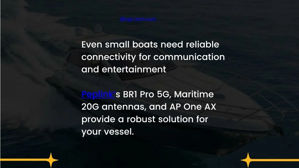 @ngt-tech.com Even small boats need reliable connectivity for communication and entertainment Peplink’s BR1 Pro 5G, Maritime 20G antennas, and AP One AX provide a robust solution for your vessel.