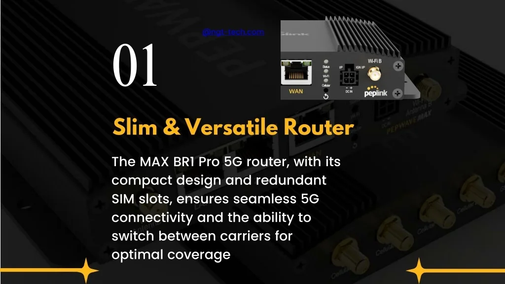 01 @ngt-tech.com The MAX BR1 Pro 5G router, with its compact design and redundant SIM slots, ensures seamless 5G connectivity and the ability to switch between carriers for optimal coverage • Slim & Versatile Router