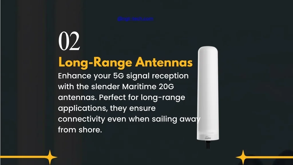02 @ngt-tech.com Enhance your 5G signal reception with the slender Maritime 20G antennas. Perfect for long-range applications, they ensure connectivity even when sailing away from shore. • Long-Range Antennas