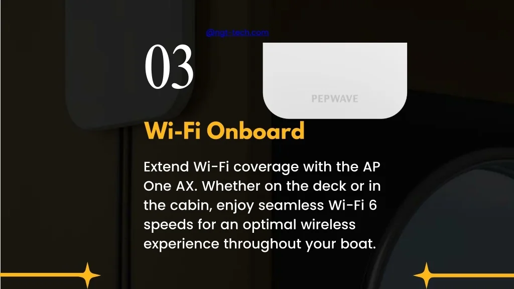 03 @ngt-tech.com Extend Wi-Fi coverage with the AP One AX. Whether on the deck or in the cabin, enjoy seamless Wi-Fi 6 speeds for an optimal wireless experience throughout your boat. • Wi-Fi Onboard