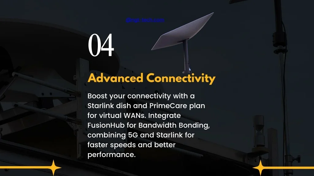 04 @ngt-tech.com Boost your connectivity with a Starlink dish and PrimeCare plan for virtual WANs. Integrate FusionHub for Bandwidth Bonding, combining 5G and Starlink for faster speeds and better performance. • Advanced Connectivity