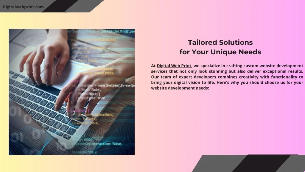 Digitalwebprint.com Tailored Solutions for Your Unique Needs At Digital Web Print, we specialize in crafting custom website development services that not only look stunning but also deliver exceptional results. Our team of expert developers combines creativity with functionality to bring your digital vision to life. Here’s why you should choose us for your website development needs:
